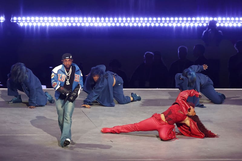 Super Bowl LIX halftime show: Kendrick Lamar and SZA perform onstage during the Super Bowl LIX halftime show. (Cindy Ord/Getty Images)