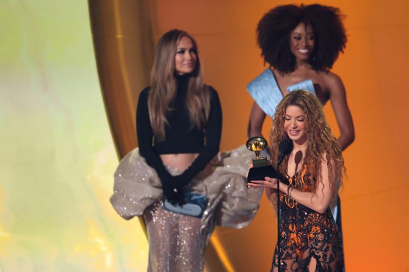 67th GRAMMY Awards - Show LOS ANGELES, CALIFORNIA - FEBRUARY 02: (FOR EDITORIAL USE ONLY) Shakira accepts the Best Latin Pop Album award for “Las Mujeres Ya No Lloran” from Jennifer Lopez onstage onstage during the 67th GRAMMY Awards at Crypto.com Arena on February 02, 2025 in Los Angeles, California. (Photo by Amy Sussman/Getty Images) (Amy Sussman/Getty Images)