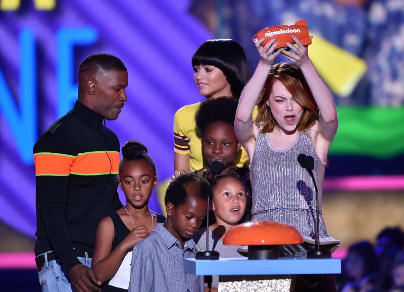 Nickelodeon's 28th Annual Kids' Choice Awards - Show INGLEWOOD, CA - MARCH 28: Actress Emma Stone (R) accepts an award from actor/singer Jamie Foxx (L), actress Zendaya (C) and guests onstage during Nickelodeon's 28th Annual Kids' Choice Awards held at The Forum on March 28, 2015 in Inglewood, California. (Photo by Kevin Winter/Getty Images) (Kevin Winter/Getty Images)