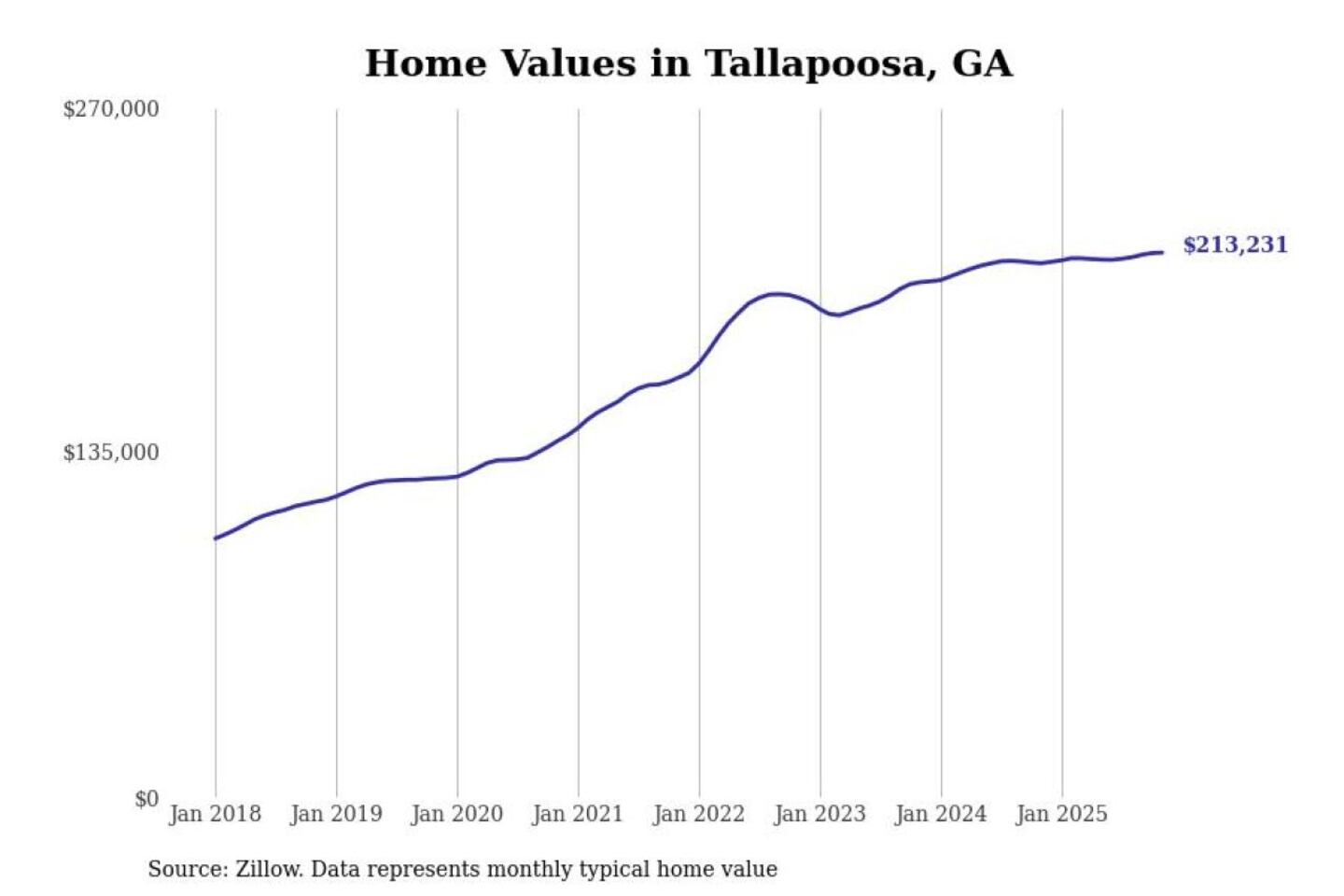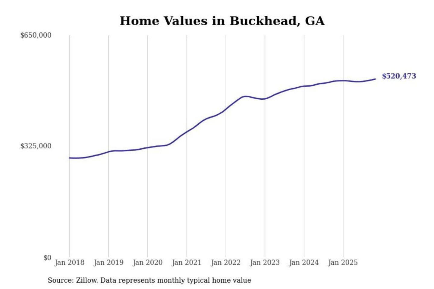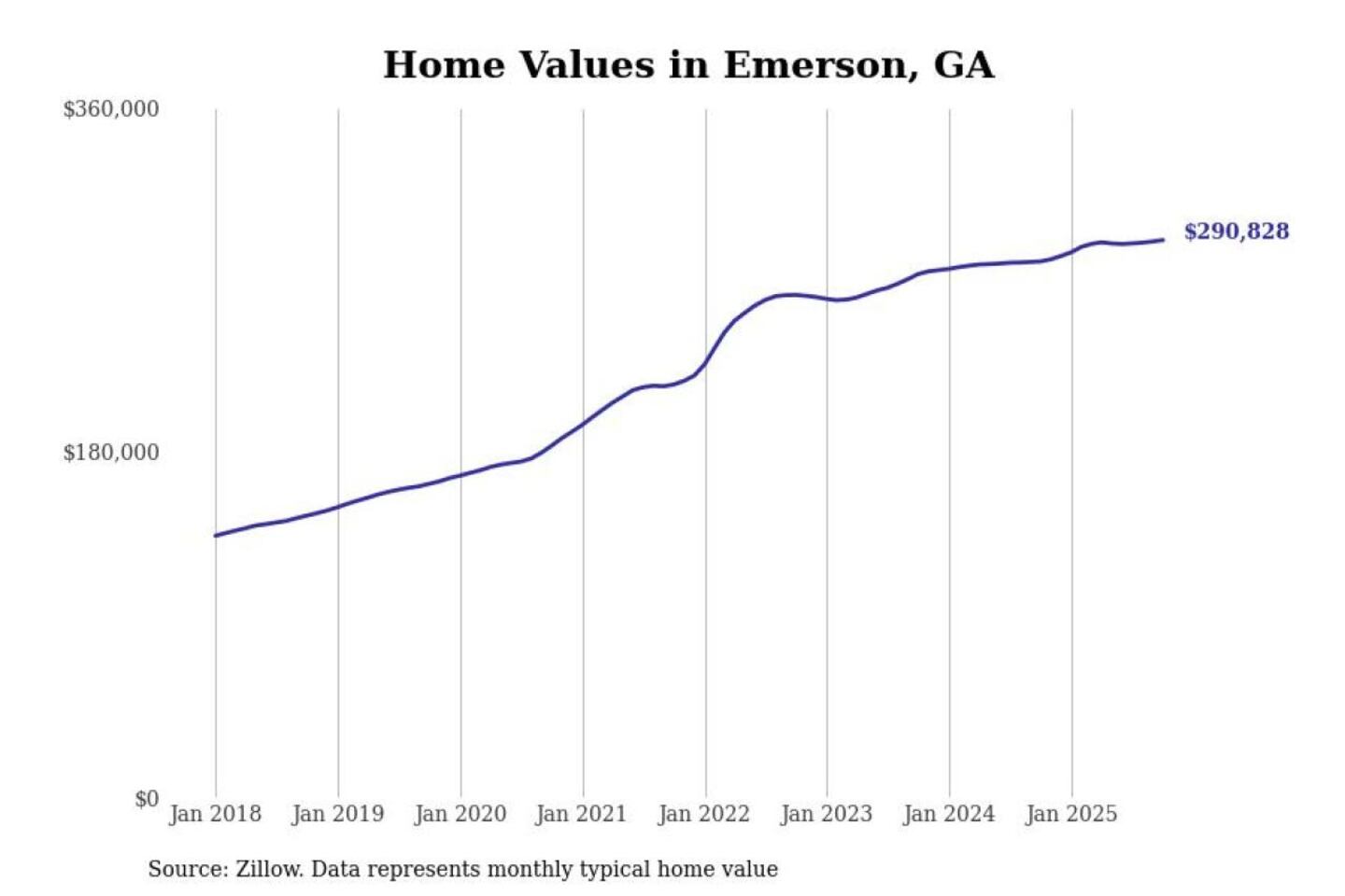 Stacker compiled a list of cities with the most expensive homes in the Atlanta-Sandy Springs-Alpharetta, GA metro area using data from Zillow. Charts show the monthly typical home value since January 2018.