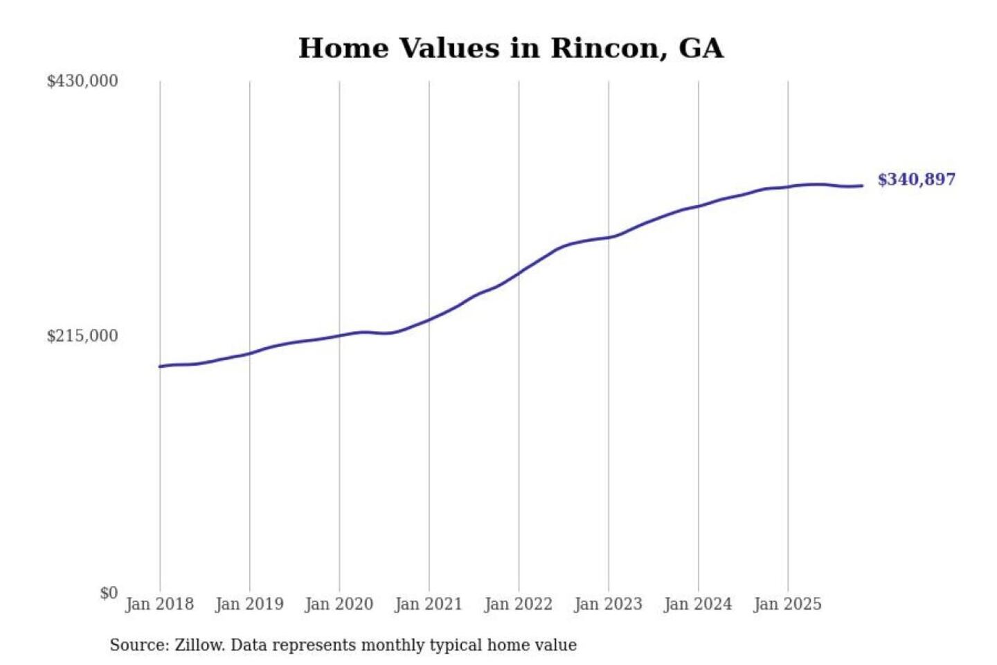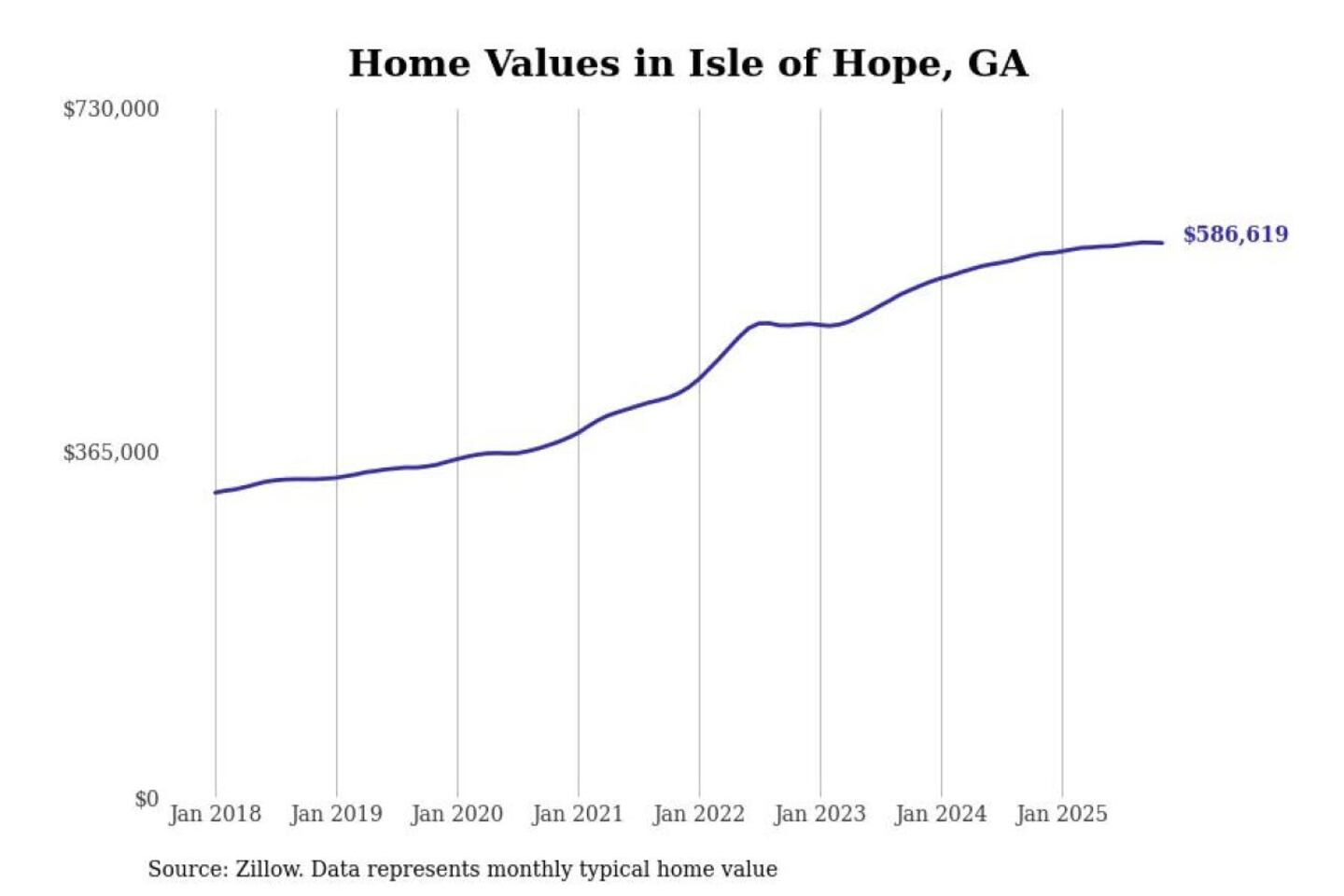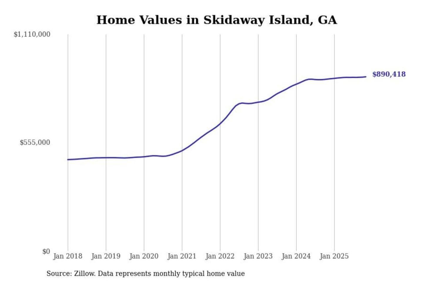Stacker compiled a list of cities with the most expensive homes in the Savannah, GA metro area using data from Zillow. Charts show the monthly typical home value since January 2018.