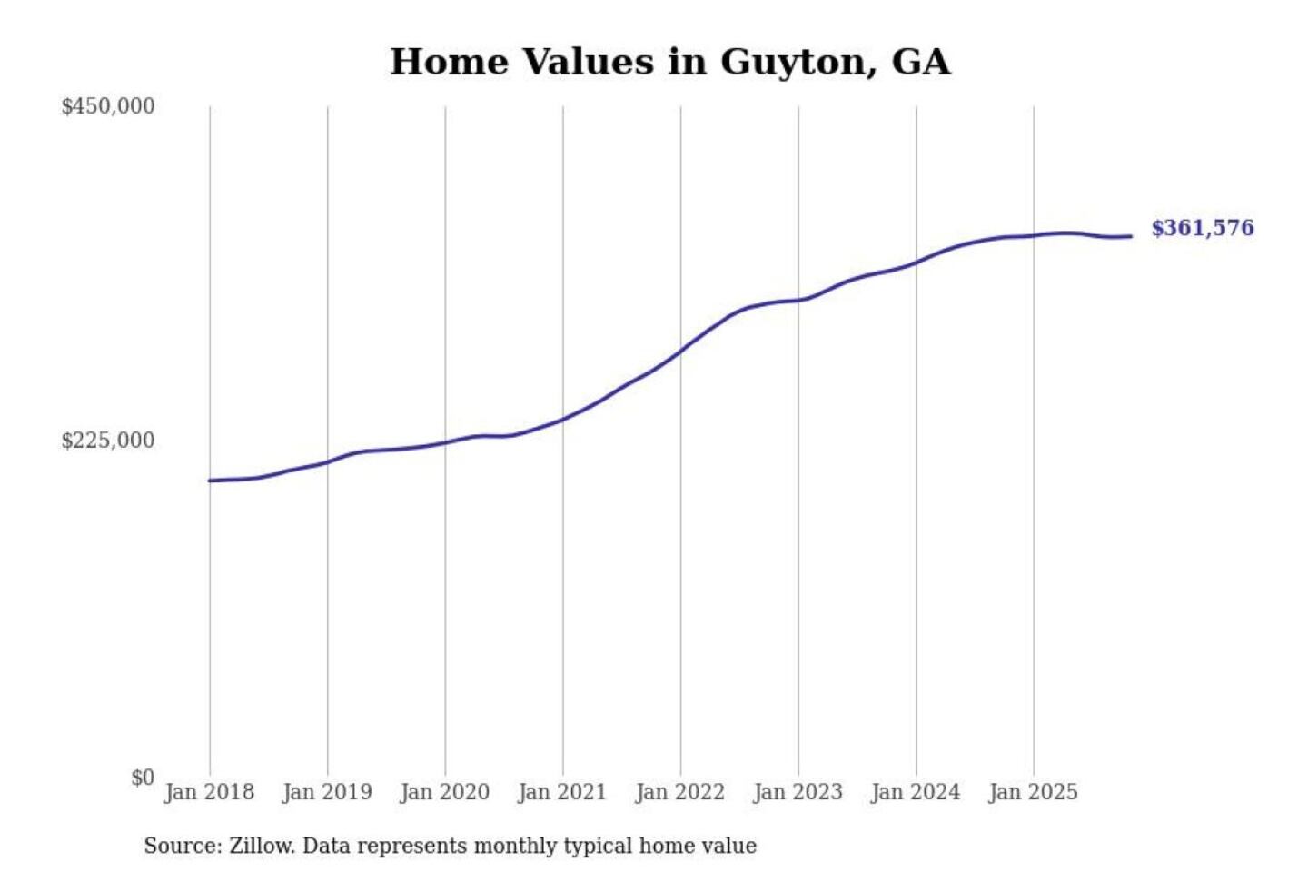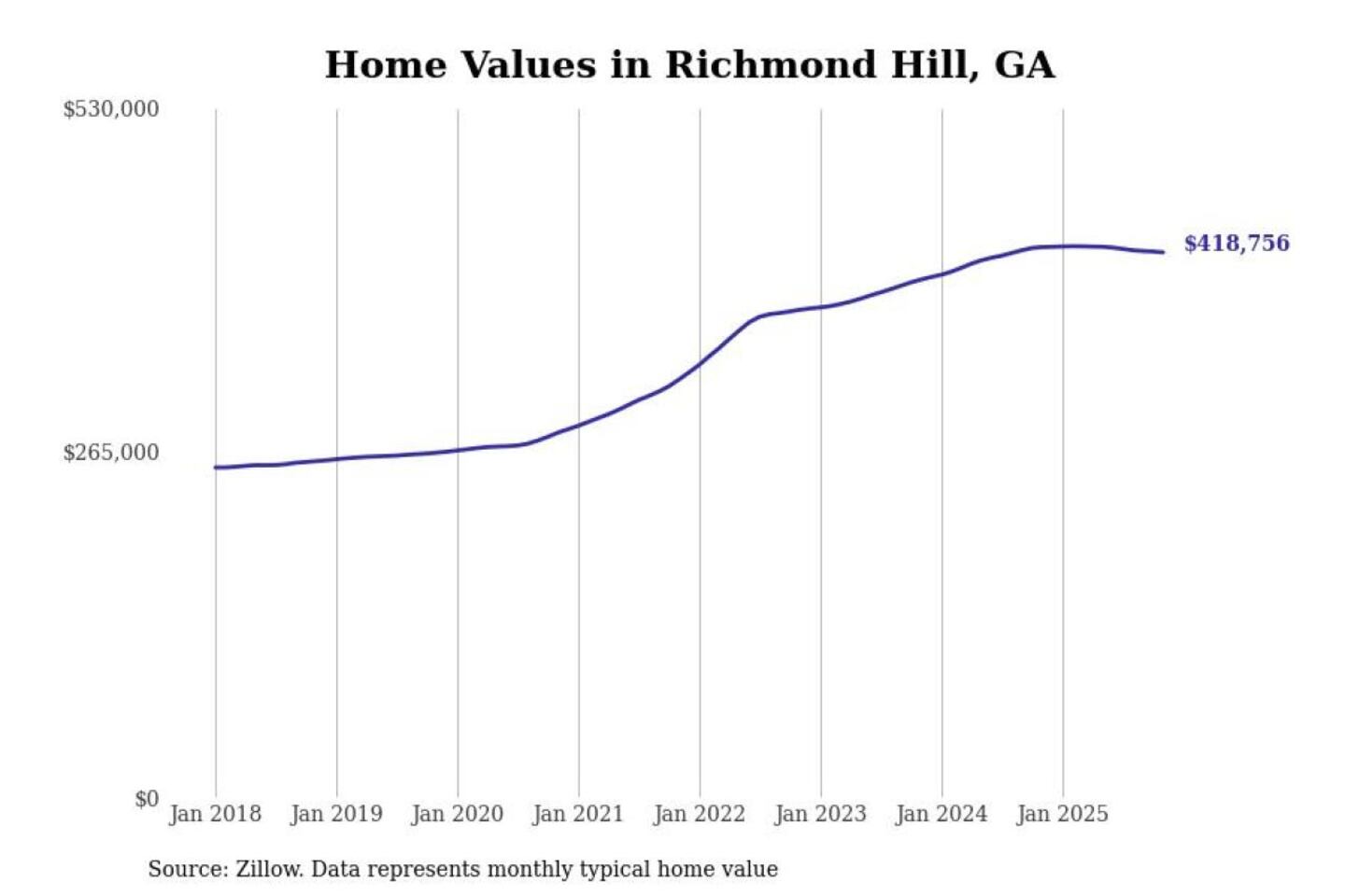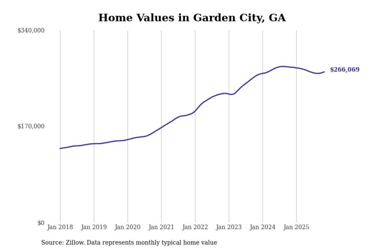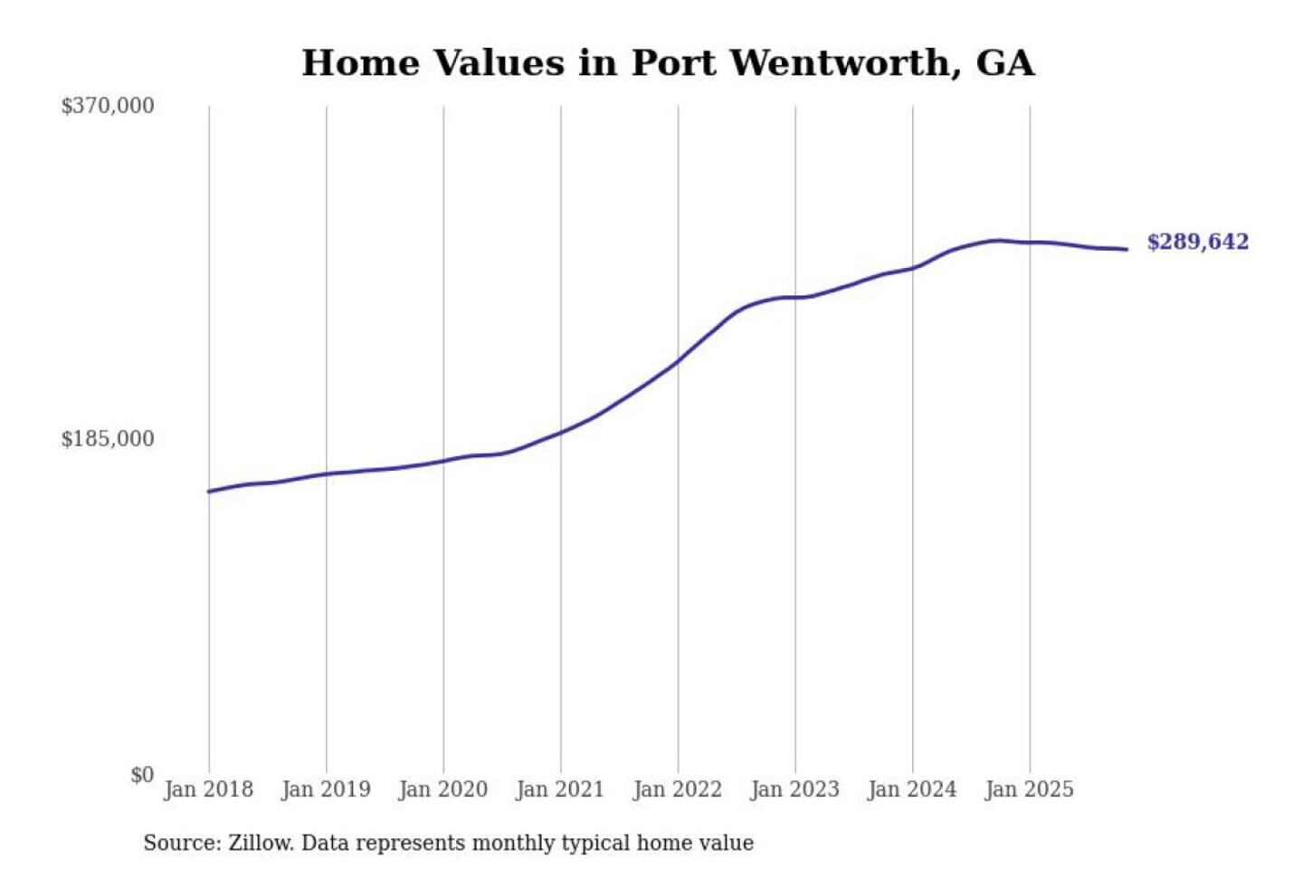 Stacker compiled a list of cities with the most expensive homes in the Savannah, GA metro area using data from Zillow. Charts show the monthly typical home value since January 2018.