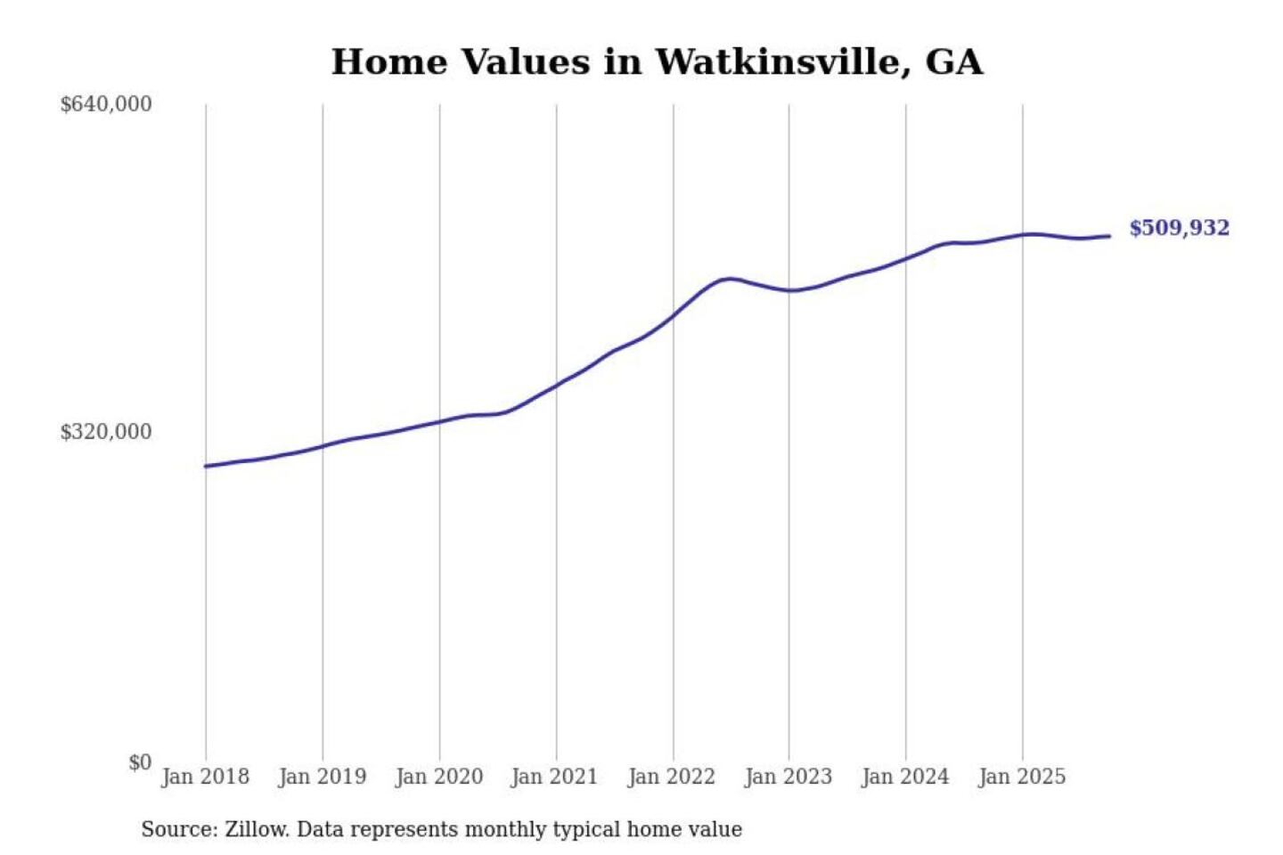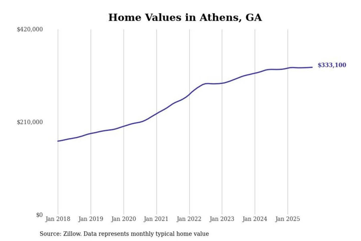 Stacker compiled a list of cities with the most expensive homes in the Athens metro area using data from Zillow. Charts show the monthly typical home value since January 2018. All 17 cities and towns with data available were included in the list.