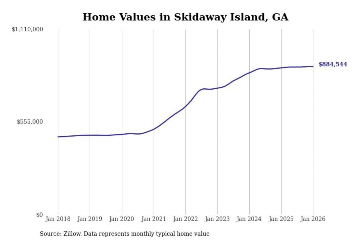 Stacker compiled a list of cities with the most expensive homes in Georgia using data from Zillow. Cities are ranked by the Zillow Home Values Index for all homes as of January 2026. The charts in this story were created automatically using Matplotlib.