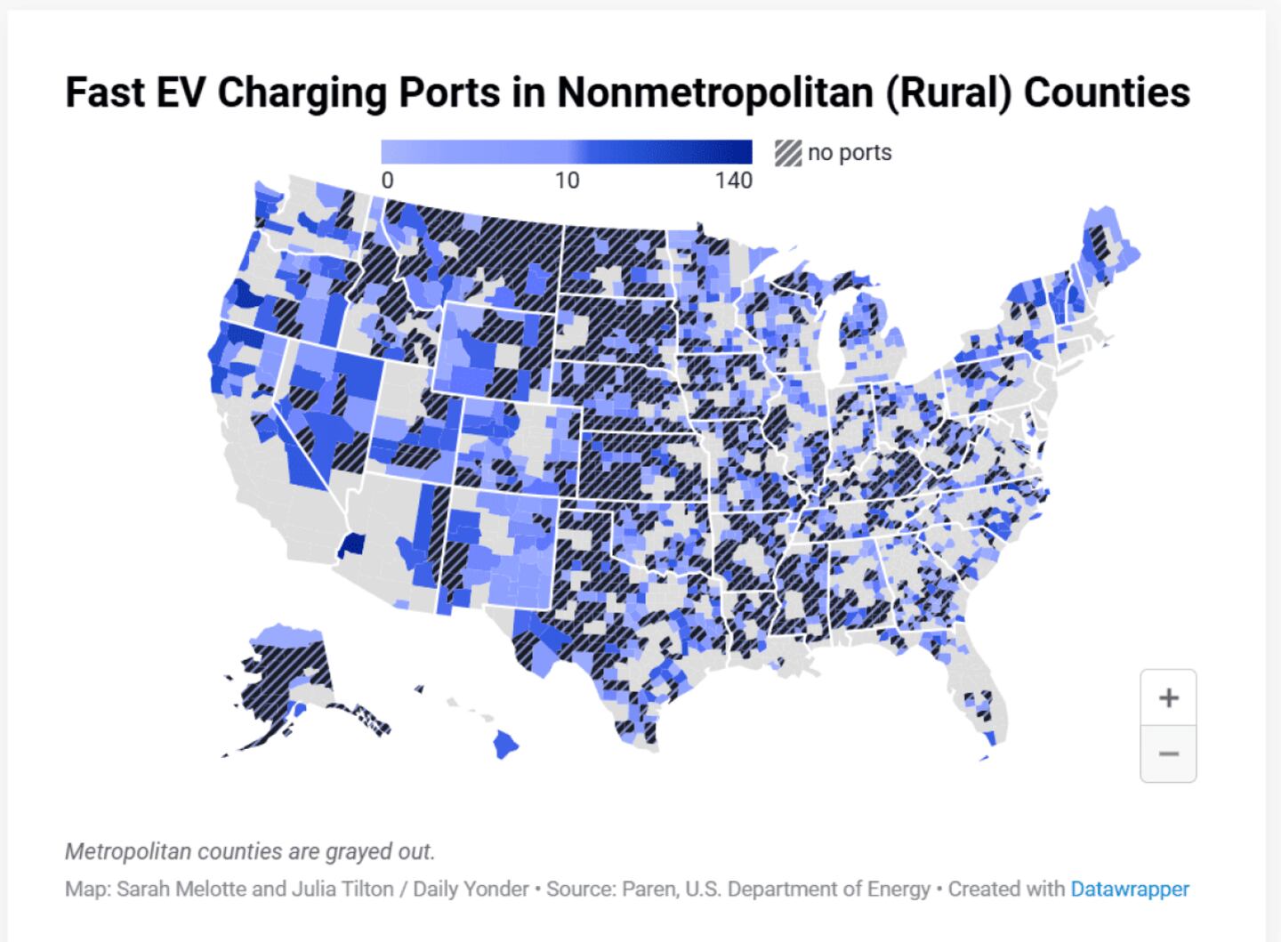 As of the first quarter of 2025, 45% of rural counties had at least one fast EV charging port installed, compared to 76.5% of metropolitan counties. Right now, the United States has around 60,000 fast charging ports installed, with more than 3,600 new ones coming online across the U.S. since the beginning of the year, Paren found. A charging port is like a gas pump—it’s where a car gets plugged in to charge up. Direct current fast charging ports, which are also called DC or level 3 chargers, take about 30 minutes to fill a car to a full charge.