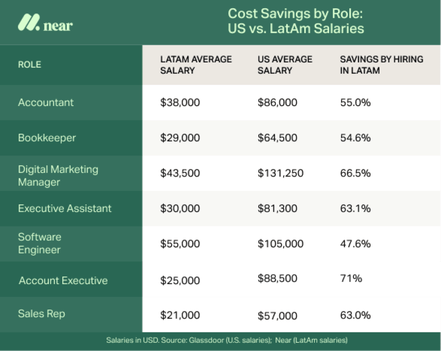 The most successful nearshoring relationships are built on finding the sweet spot: paying competitive rates for Latin America while still making savings compared to U.S. salaries.