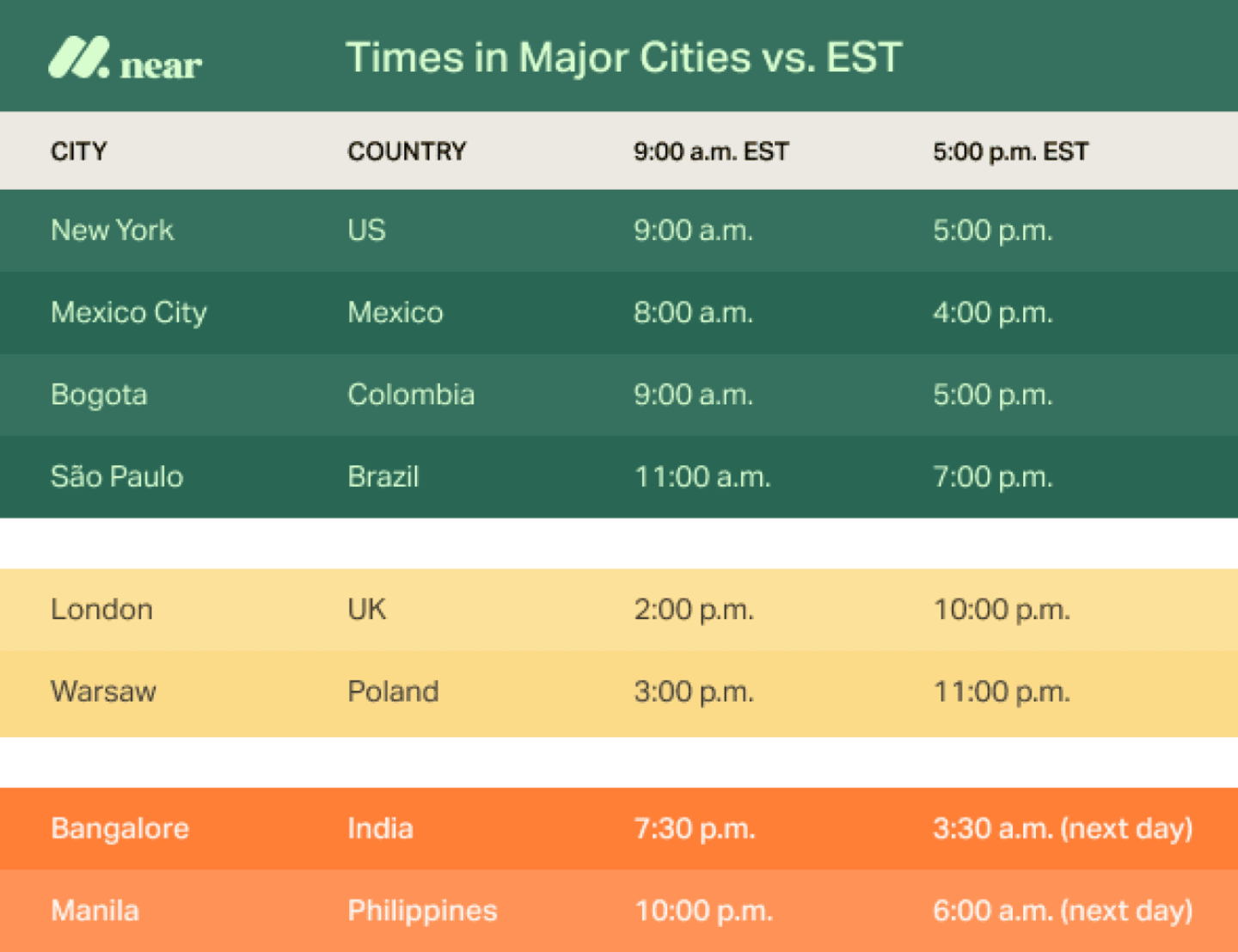 Wherever you're based in the mainland U.S., there are LatAm countries in the same time zone or within a one- to two-hour difference.